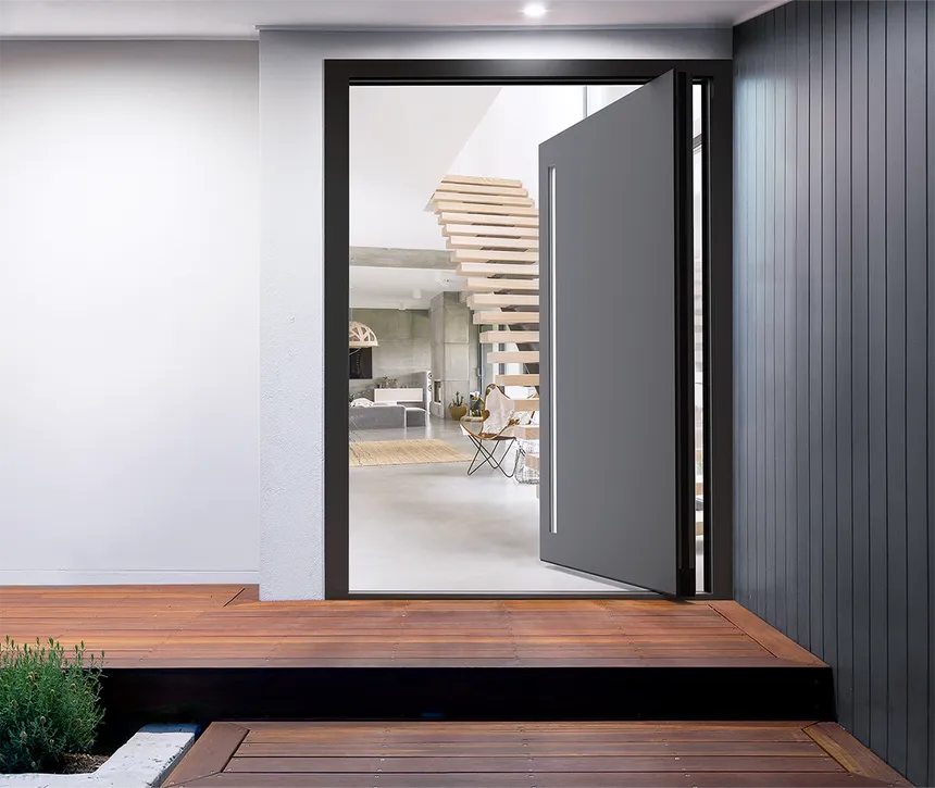 Puerta de entrada de clase premium con diseño coplanar. La hoja y el marco están en el mismo plano, creando el efecto de una superficie monolítica. Solución ideal para entradas principales de chalets y edificios comerciales.