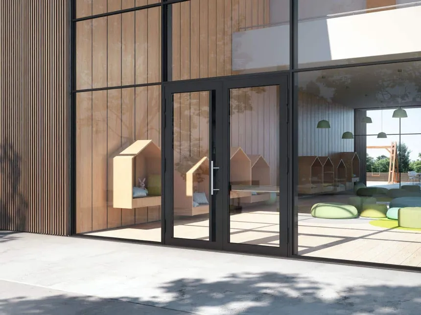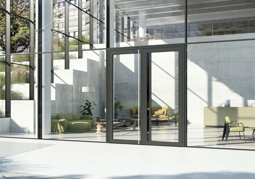El sistema permite utilizar rellenos que cubren el perfil de la hoja en uno o ambos lados. Como resultado, se obtiene una hoja de puerta lisa y moderna sin costuras ni escalones visibles, que se integra perfectamente en la fachada.