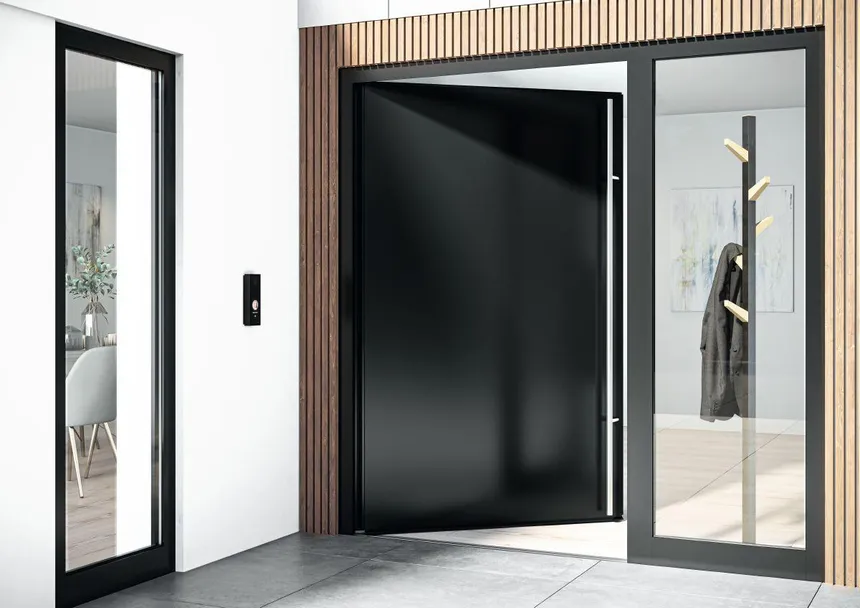 Puerta de entrada de clase premium con diseño coplanar. La hoja y el marco están en el mismo plano, creando el efecto de una superficie monolítica. Solución ideal para entradas principales de chalets y edificios comerciales.