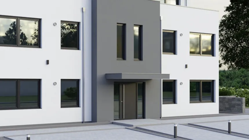 Puerta de entrada de PVC óptima de 70 mm con la mejor relación calidad-precio alemana. Perfil de 5 cámaras, superficie HDF brillante y herrajes de seguridad.