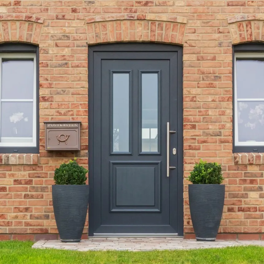 Puerta de entrada clásica y fiable de PVC de 70mm con alta estabilidad y diseño redondeado elegante. Acabado premium con superficie HDF de larga duración.