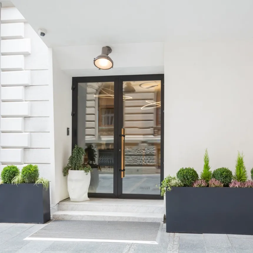 Las puertas de entrada soportan cargas enormes. El grosor de la pared exterior de 3 mm (Clase A) proporciona una base «carnosa» para los tornillos de fijación de las bisagras. Las bisagras no se aflojan ni se arrancan del perfil incluso con un flujo intenso de personas.