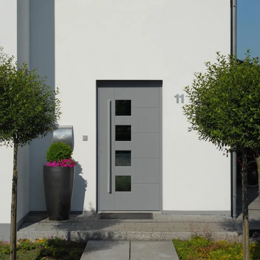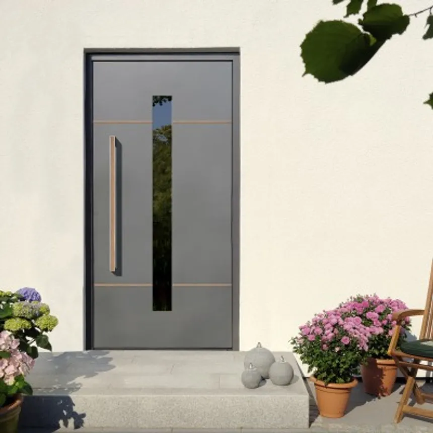 Puerta de entrada de gama alta. Sistema energéticamente eficiente de 82 mm con tres juntas de sellado para casas pasivas.