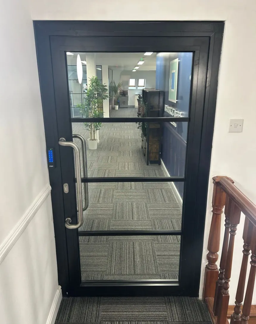 Instalamos cerraduras con 5 puntos de cierre (ganchos y pernos). Al girar la llave, la puerta se bloquea por todo el perímetro, haciendo que el forzado de la hoja con palanca sea prácticamente imposible (clase RC2).