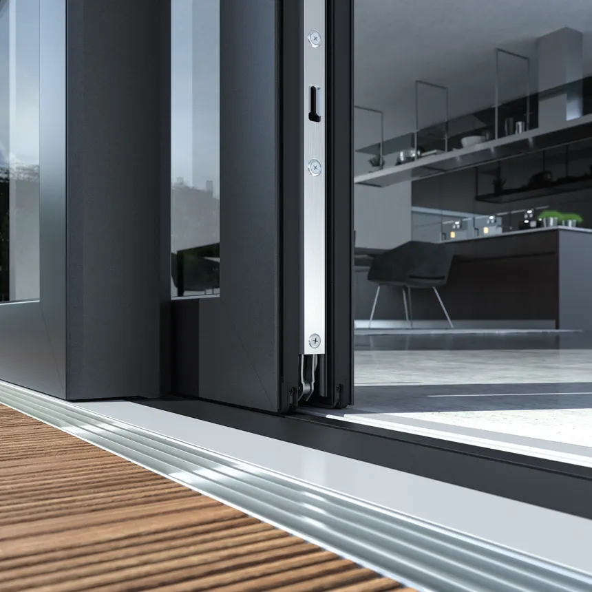 Gracias a la separación térmica del umbral y el perfil de refuerzo, así como a la profundidad de hoja de 82 mm, el sistema previene la formación de puentes térmicos. Esto permite evitar la condensación en el suelo y conservar el calor en casa.